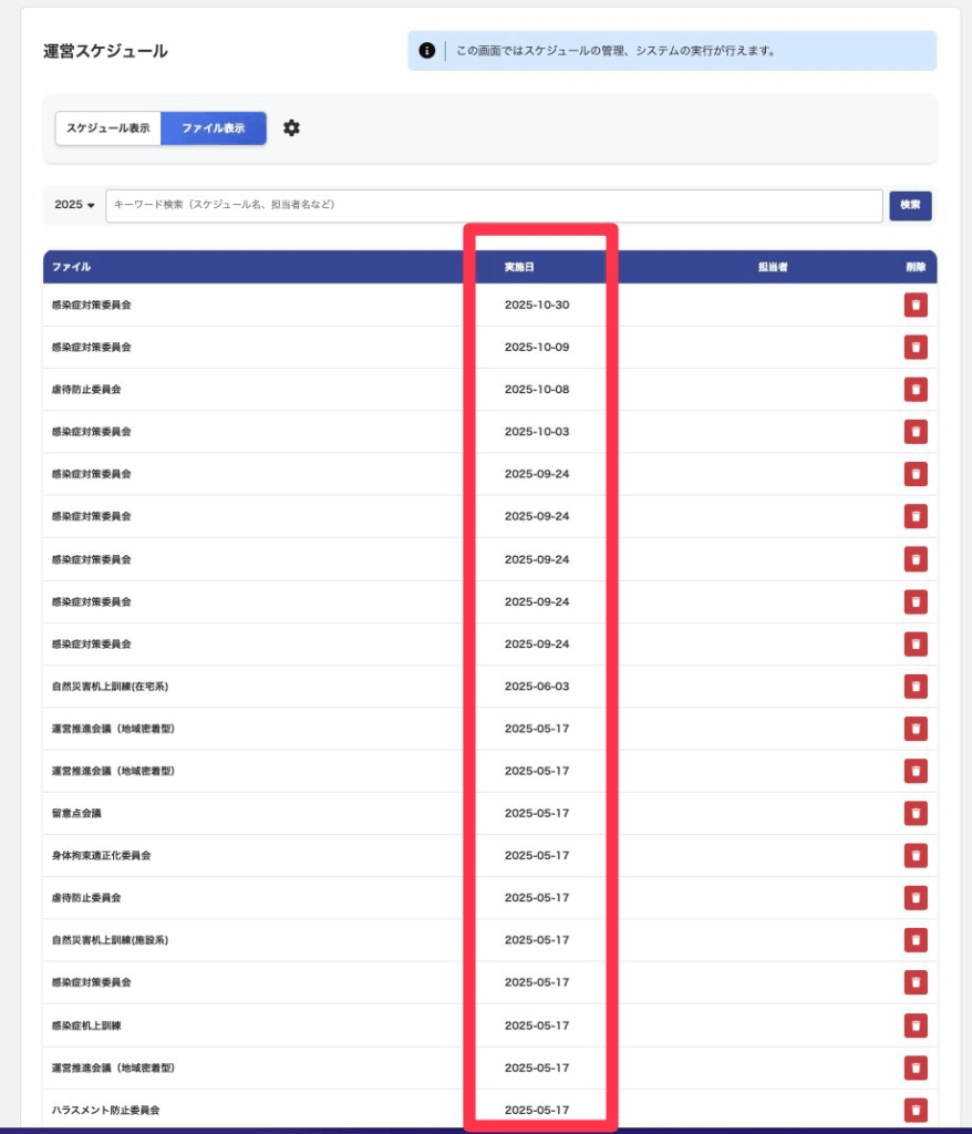 確認方法:管理画面 → 運営スケジュール → 「ファイル表示」を開くと、開催日に基づき時系列で表示されます。